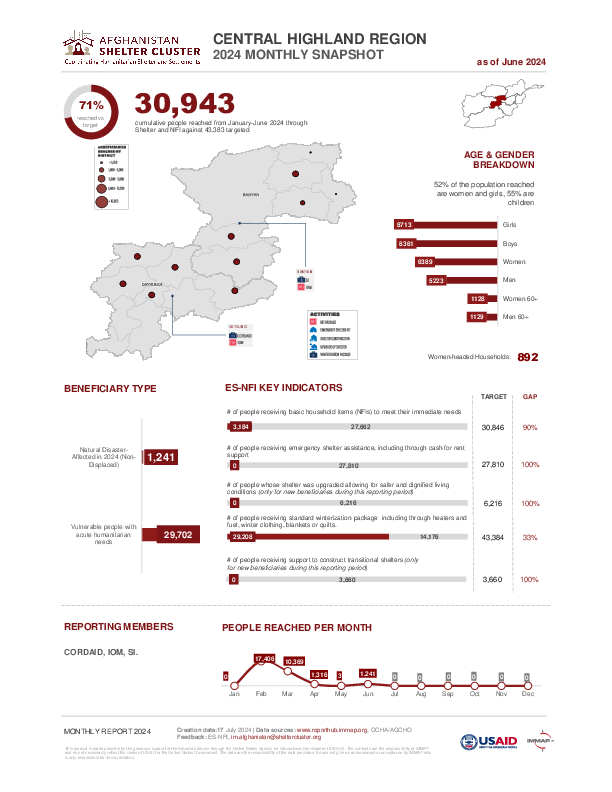AFG CENTRAL HIGHLAND REGION-ES-NFI Cluster HRP Dashboard as of June 2024