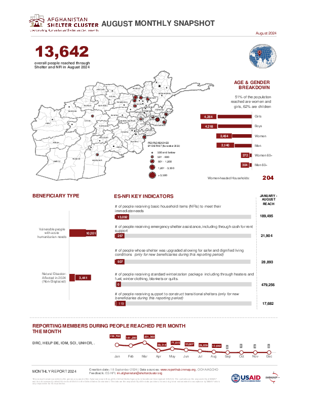 The document is a monthly humanitarian report detailing emergency shelter and non-food items (NFI) support in Afghanistan for August 2024. It provides data on aid distributed across various districts, focusing on vulnerable populations such as women, children, and the elderly. The report includes contributions from multiple aid organizations, with overall coordination by the Shelter Cluster in Afghanistan.
