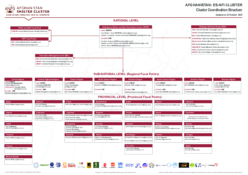 The document outlines the coordination structure of the Emergency Shelter and Non-Food Items (ES-NFI) Cluster in Afghanistan. Updated as of October, 2024, it details the leadership and coordination teams at the national, sub-national, and provincial levels. Key organizations involved include UNHCR and IOM, with numerous focal points across different regions of Afghanistan, all tasked with managing various aspects of humanitarian shelter and aid distribution. The document includes contacts for coordinators, co-chairs, strategic advisory groups, PSEA and GBV focal points, AAP focal points, IM team, regional focal points, and provincial focal points indicating a well-structured network designed to effectively address the needs of those requiring emergency shelter and related supplies.