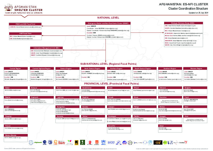 The document outlines the coordination structure of the Emergency Shelter and Non-Food Items (ES-NFI) Cluster in Afghanistan. Updated as of July 29, 2024, it details the leadership and coordination teams at the national, sub-national, and provincial levels. Key organizations involved include UNHCR and IOM, with numerous focal points across different regions of Afghanistan, all tasked with managing various aspects of humanitarian shelter and aid distribution. The document includes contacts for coordinators, co-chairs, strategic advisory groups, PSEA and GBV focal points, AAP focal points, IM team, regional focal points, and provincial focal points indicating a well-structured network designed to effectively address the needs of those requiring emergency shelter and related supplies.