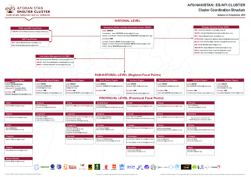 The document outlines the coordination structure of the Emergency Shelter and Non-Food Items (ES-NFI) Cluster in Afghanistan. Updated as of September, 2024, it details the leadership and coordination teams at the national, sub-national, and provincial levels. Key organizations involved include UNHCR and IOM, with numerous focal points across different regions of Afghanistan, all tasked with managing various aspects of humanitarian shelter and aid distribution. The document includes contacts for coordinators, co-chairs, strategic advisory groups, PSEA and GBV focal points, AAP focal points, IM team, regional focal points, and provincial focal points indicating a well-structured network designed to effectively address the needs of those requiring emergency shelter and related supplies.