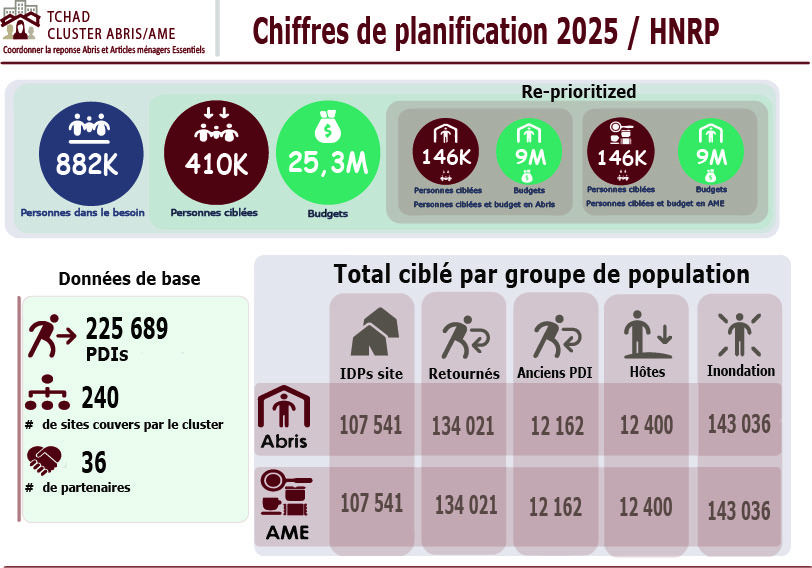 Les clusters Abris et CCCM (regroupés en un seul secteur au Tchad) ont été activés en 2014 afin d’apporter un soutien aux retournés tchadiens (RT) arrivés de Centrafrique avec le HCR comme agence lead et l’OIM comme agence Co-chair. Depuis 2016, faute de partenaires tant en CCCM qu’en Abris, et suite au « Plan de réponse globale en faveur des retournés tchadiens de la République Centrafricaine » alors développé par le gouvernement tchadien, le cluster n’assure plus de coordination dans le Sud, mais poursuit une veille et le plaidoyer pour les abris.
