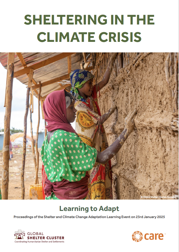 This report is the output of an online learning event on Climate Change Adaptation held in January 2025, hosted by CARE International UK in collaboration with the Global Shelter Cluster’s Environment Community of Practice. The learning event focused on integrating climate resilience into humanitarian shelter and settlement programming and aimed to bridge knowledge gaps, identify best practices, and enhance collaboration. It brought together shelter practitioners, climate specialists and others to explore the WHY, WHAT, HOW and WHAT NEXT of integrating CCA with shelter and settlements programming. Participants explored how CCA fits within broader environment and disaster risk reduction spheres of activity. Examples of entry points for CCA in the typical response cycle - preparedness, response, recovery and reconstruction - were highlighted. Existing tools and resources that can guide and enhance CCA within shelter and settlements (and multisector) programming were shared. Case studies from Zimbabwe, Mali and Nigeria, and Vietnam showcased. Key outcomes of the event included increased awareness, knowledge sharing and actionable recommendations. The concluding comments and recommendations in the What Next? section of this report were derived from analysis of all contributions to the learning event. They intend to prompt further reflection and suggest next steps for enhanced climate-smart humanitarian action. An open invitation exists for interested parties to continue these discussions and access further learning opportunities through the Global Shelter Cluster’s Environment Community of Practice.