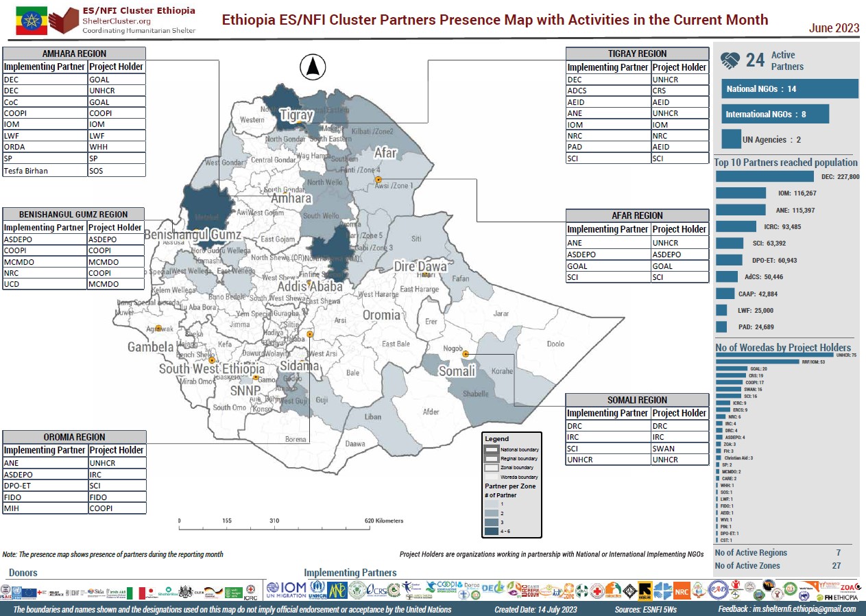 Ethiopia Emergency Shelter & NFI Cluster Partners Presence Map as 30 June 2023
