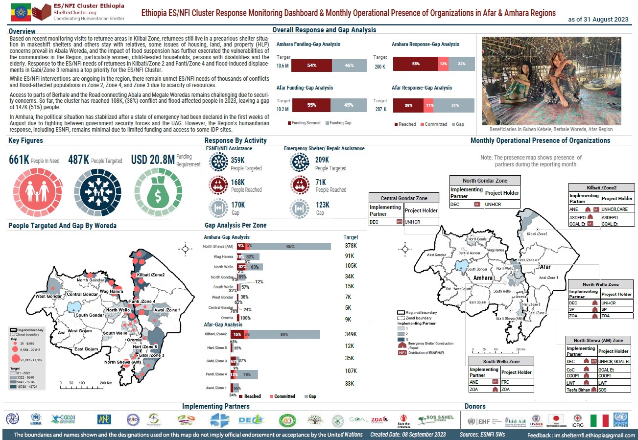 Ethiopia ESNFI Cluster Response Monitoring Dashboard & Monthly Operational Presence of Organizations in Afar & Amhara as of August 31, 2023
