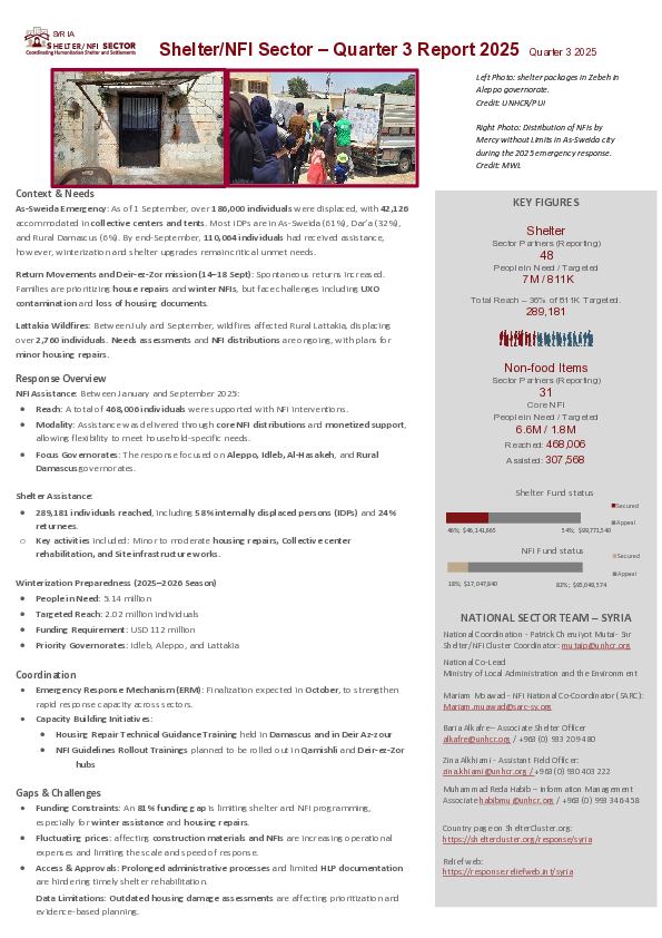 Urgent shelter and NFI needs span both emergency and recovery contexts: -