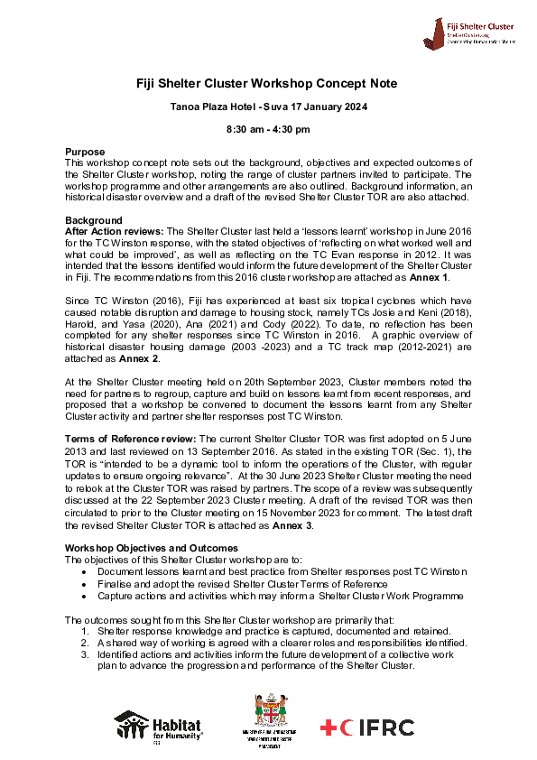 The Fiji National Shelter Cluster is led by the Ministry of Rural and Maritime Development and Disaster Management (MRMDDM) with the support of two co-leads: the International Federation of Red Cross and Red Crescent Societies (IFRC) for preparedness and response, and Habitat for Humanity Fiji (HFHF) for preparedness.