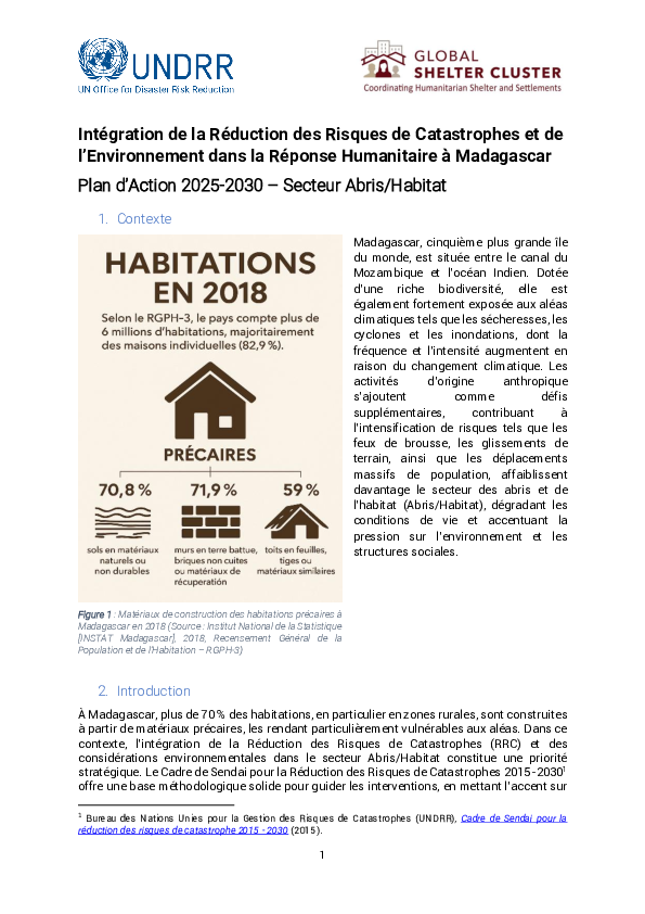 Intégration de la Réduction des Risques de Catastrophes et de l’Environnement dans la Réponse Humanitaire à Madagascar. Ce document donne les grandes lignes du plan d’action Abris/Habitat 2025-2030 pour une appropriation rapide par les praticiens et décideurs du secteur Abris/Habitat. A la différence de la version courte, ce document donne davantage de détails sur le plan d'action