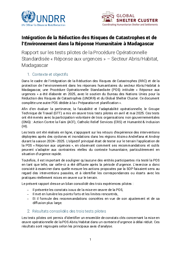 Procédure Opérationnelle Standardisée « Réponse aux urgences » – Secteur Abris/Habitat, Madagascar: Afin d’en évaluer la pertinence, la faisabilité et l’adaptabilité opérationnelle, le Groupe Technique de Travail (GTT) a mis en œuvre trois tests pilotes en avril et mai 2025. Ces tests ont été menés avec la participation volontaire de trois organisations non gouvernementales (ONG) : Action Contre la Faim (ACF), Catholic Relief Services (CRS) et Humanité & Inclusion (HI).