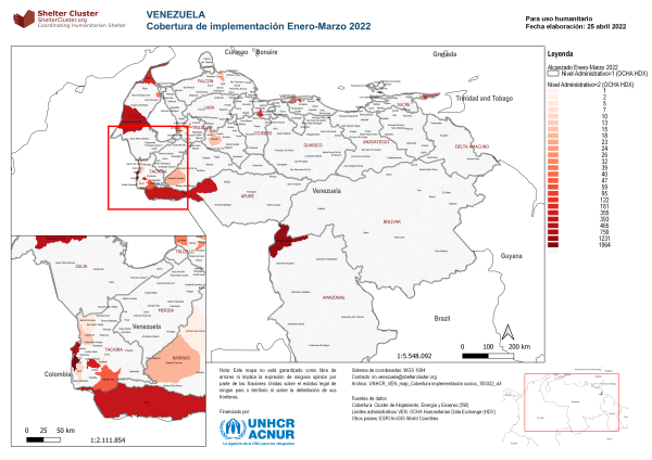 - By the end of March, the Shelter, Energy and NFI Cluster reached 5,911 direct beneficiaries through partner organizations. Activities covered 11 states and Capital District. As key figures for the response, 14 spaces delivering essential services to communities were built and rehabilitated, 4 Refugee Housing Units (RHUs), 27 street solar lamps and 8 systems to generate energy were installed, 668 portable solar lamps and 146 habitat kits were delivered for the most vulnerable population, 2208 individual kits were provided for people on the move, and 1124 people occupied temporary collective shelters.