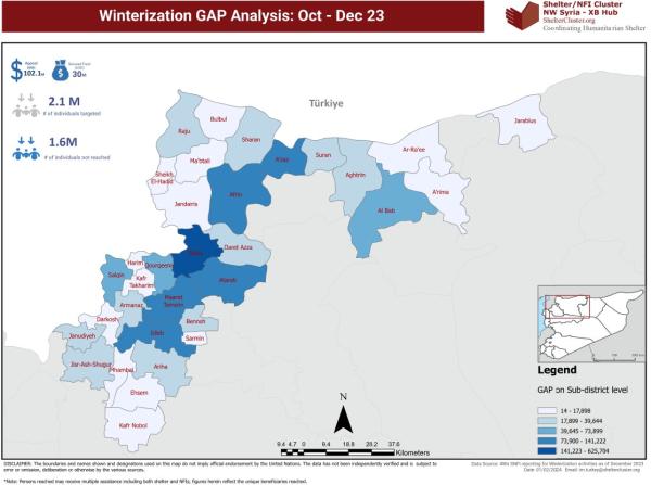 One of the top priorities for the Shelter/NFI Cluster during the fourth quarter was to continue coordinating the winterization response. The long, extremely cold, and unpredictable winters in NW Syria cause acute suffering for 2.1 million people in need of winter assistance. In recent years, there has been an increase in extreme weather conditions, such as sub-zero temperatures, heavy snowfall, and widespread flooding. While there are some members has been reported a cut in the winterization fund in this season. As a result, the needs of vulnerable people living in dire conditions have also increased. Recent data shows that 70% is the funding gap for this season and a bout 1,2 M vulnerable individuals will not be reached due to this gap. Additionally, close to 1/3 of the IDP population in camps resort to harmful coping mechanisms during winter, such as burning old clothes and waste materials for heating. Winterization needs are urgent and must be addressed every winter.