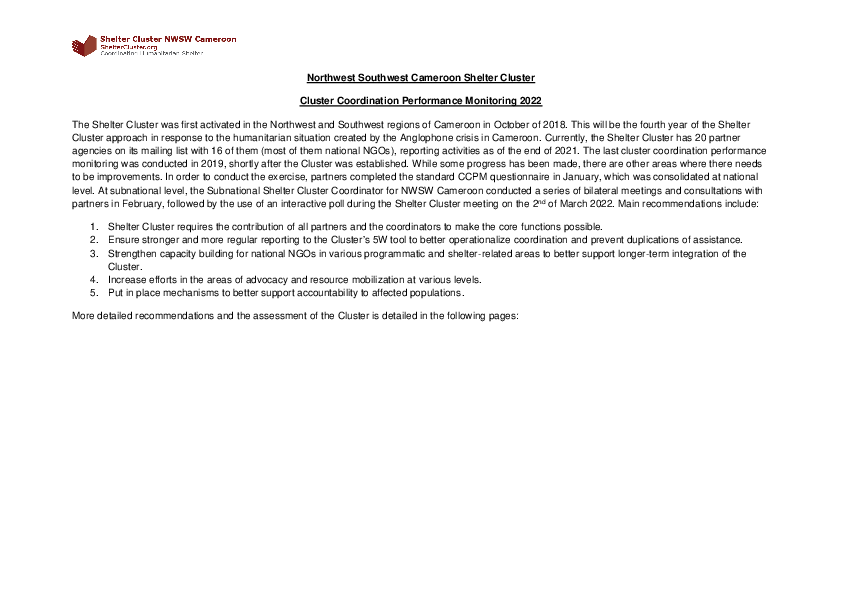 The Shelter Cluster was first activated in the Northwest and Southwest regions of Cameroon in October of 2018. This will be the fourth year of the Shelter Cluster approach in response to the humanitarian situation created by the Anglophone crisis in Cameroon. Currently, the Shelter Cluster has 20 partner agencies on its mailing list with 16 of them (most of them national NGOs), reporting activities as of the end of 2021. The last cluster coordination performance monitoring was conducted in 2019, shortly after the Cluster was established. While some progress has been made, there are other areas where there needs to be improvements. In order to conduct the exercise, partners completed the standard CCPM questionnaire in January, which was consolidated at national level. At subnational level, the Subnational Shelter Cluster Coordinator for NWSW Cameroon conducted a series of bilateral meetings and consultations with partners in February, followed by the use of an interactive poll during the Shelter Cluster meeting on the 2nd of March 2022. Main recommendations include: