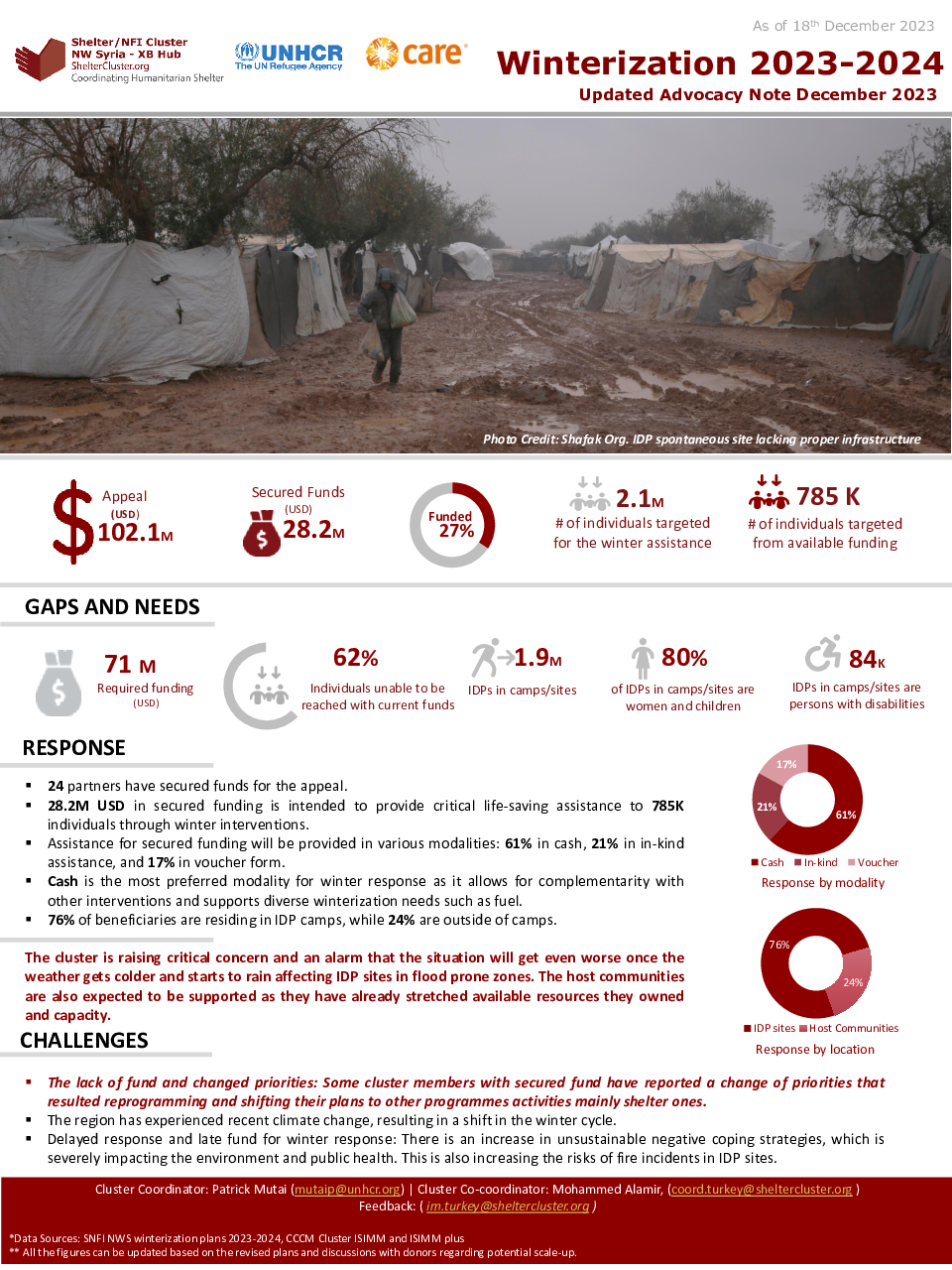 Cash is the most preferred modality for winter response as it allows for complementarity with other interventions and supports diverse winterization needs such as fuel.