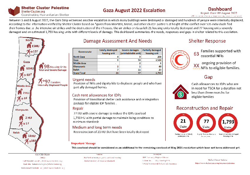 Between 5 and 8 August 2022, the Gaza Strip witnessed another escalation in which many buildings were destroyed or damaged and hundreds of people were internally displaced According to the information verified by Shelter Cluster based on figures from MoPWH, MoSD, and other cluster partners at height of the conflict over 535 individuals fled  their homes due to the intensive air strikes and the destruction of their houses, the air strikes on Gaza left 21 housing units totally destroyed and 77 housing units severely .damaged and an estimated 1,793 housing units with different levels of damage. This dashboard summarizes the needs, responses and gaps in shelter related to this escalation