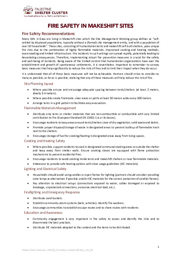 Sites consisting of humanitarian tents and makeshift self built shelters, pose unique fire risks due to the combination of highly flammable materials, improvised cooking and heating methods, overcrowding and limited infrastructure. Fire incidents in such settings can spread rapidly, potentially leading to devastating consequences. Therefore, implementing robust fire prevention measures is crucial for the safety and well-being of residents.