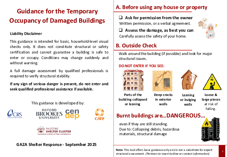 This IEC is intended to guide households in carrying out basic, household-level visual checks of damaged buildings. It does not constitute structural or safety certification and cannot guarantee a building is safe to enter or occupy. Conditions may change suddenly and without warning. A full damage assessment by qualified professionals is required to verify structural stability.