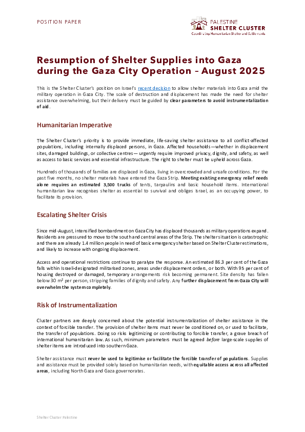 This is the Shelter Cluster’s position on Israel’s recent decision to allow shelter materials into Gaza amid the military operation in Gaza City. The scale of destruction and displacement has made the need for shelter assistance overwhelming, but their delivery must be guided by clear parameters to avoid instrumentalization of aid.