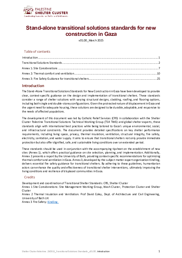 The Stand-Alone Transitional Solutions Standards for New Construction in Gaza have been developed to provide clear, context-specific guidance on the design and implementation of transitional shelters. These standards consider a range of shelter solutions with varying structural designs, cladding, roofing, and flooring options, including both single and double-storey configurations. Given the protracted nature of displacement in Gaza and the urgent need for adequate housing, these solutions are designed to be durable, adaptable, and responsive to the needs of affected populations.