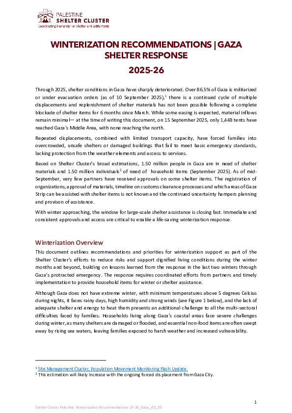 This document outlines recommendations and priorities for winterization support as part of the Shelter Cluster's efforts to reduce risks and support dignified living conditions during the winter months and beyond, building on lessons learned from the response in the last two winters through Gaza’s protracted emergency. The response requires coordinated efforts from partners and timely implementation to provide household items for winter or shelter assistance.