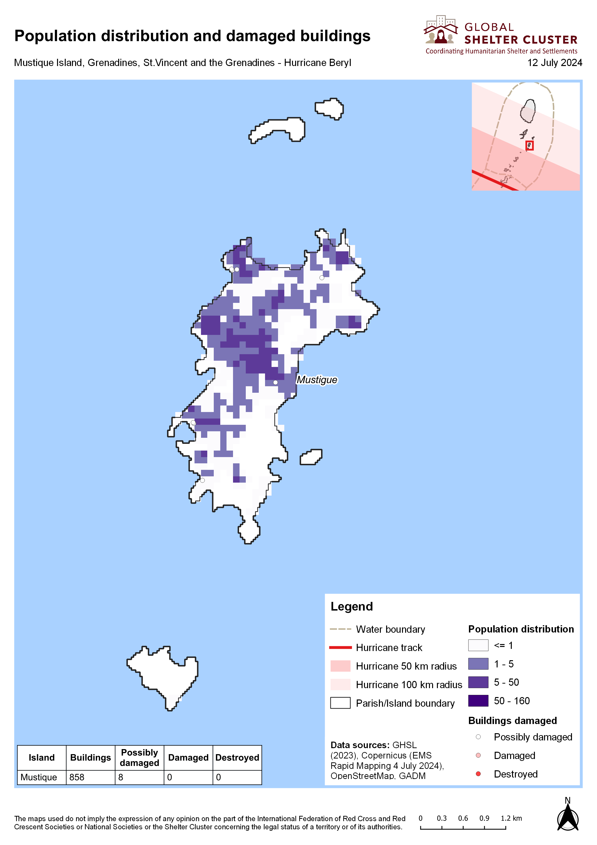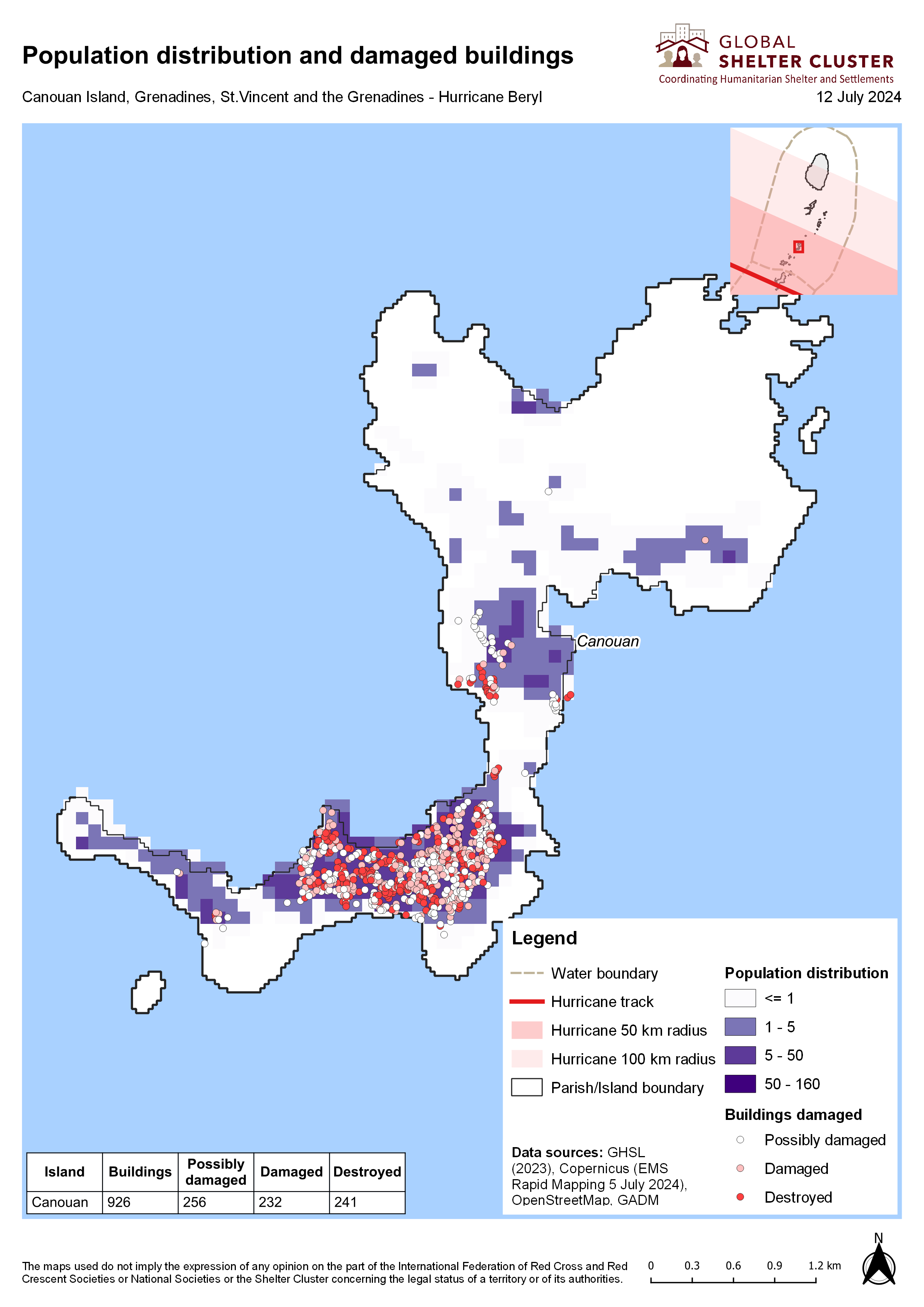 In Grenada, more than 1,600 people were reported in collective shelters, and as of July 8 around 383 persons. More than 98 per cent of the buildings have been severely affected in the Union, Carriacou and Petit Martinique islands, where most of the health facilities are compromised, as well as the terminal building Carriacou airport, schools and petrol stations. The northern parishes of St. Patrick, St. David, and St. Andrew on the main island also experienced significant housing and agricultural losses. The National Water and Sewerage Authority (NAWASA) reports only 52% of Grenada's water systems are operational, and communication is disrupted in Carriacou, Petite Martinique, and northern Grenada. There have been reports of severe agricultural destruction, particularly in Carriacou and Petit Martinique.