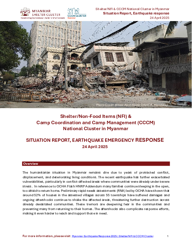 The humanitarian situation in Myanmar remains dire due to years of protracted conflict, displacement, and deteriorating living conditions. The recent earthquake has further exacerbated vulnerabilities, particularly in conflict-affected areas where communities were already under severe stress. In reference to OCHA Flash HNRP Addendum many families continue sleeping in the open, too afraid to return home. Preliminary rapid needs assessments (RNA) led by OCHA have shown that around 52% of houses in the assessed villages across 55 townships have suffered damages and ongoing aftershocks continue to shake the affected areas, threatening further destruction across already devastated communities. These tremors are deepening fear in the communities and preventing many from returning to their homes. The aftershocks also complicate response efforts, making it even harder to reach and support those in need. The Earthquake response dashboard presents a summary of the Shelter/NFI response by cluster members.
