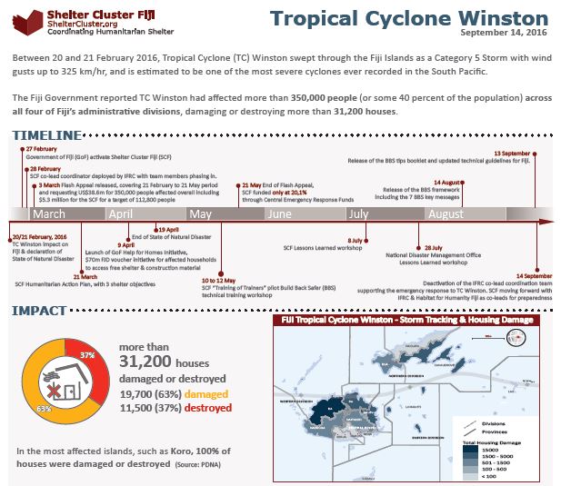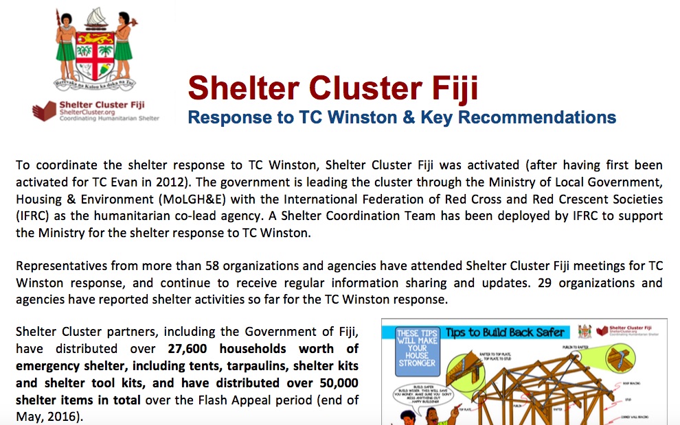 The Government of Fiji has led the overall response to TC Winston. To coordinate the shelter response, Shelter Cluster Fiji was activated (after having first been activated for TC Evan in 2012), and it has been led by the Ministry of Local Government, Housing & Environment (MoLGH&E) with the International Federation of Red Cross and Red Crescent Societies (IFRC) as the humanitarian co-lead agency. A Shelter Coordination Team was deployed by IFRC to support the Ministry for the shelter response to TC Winston.