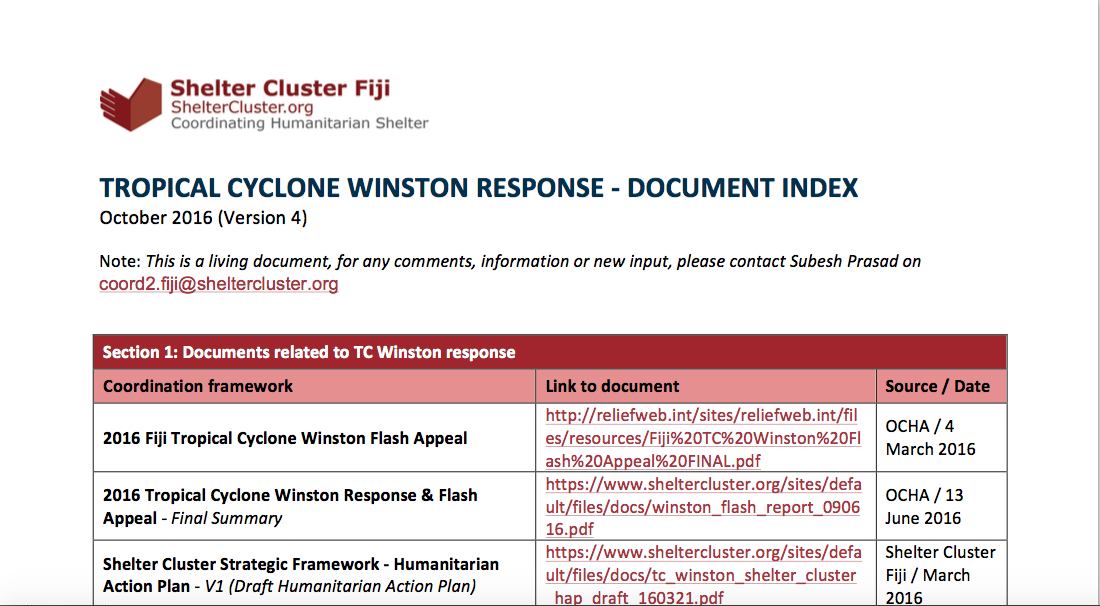 As of July, 2016 representatives from more than 58 organizations and agencies have attended Shelter Cluster Fiji meetings for the TC Winston response, and continue to receive regular information sharing and updates. 29 organizations and agencies have reported shelter activities so far for the TC Winston response. Shelter Cluster Fiji partners, including the Government of Fiji, have distributed over 27,600 households worth of emergency shelter, including tents, tarpaulins, shelter kits and shelter tool kits, and have distributed over 50,000 shelter items in total over the Flash Appeal period (end of May, 2016).