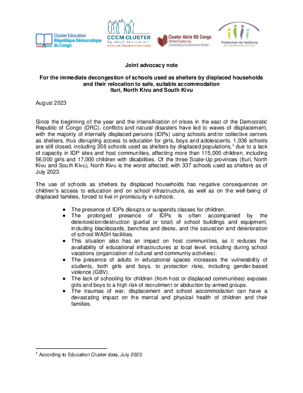 DR Congo Joint advocacy note for reopening schools used as shelters August 2023