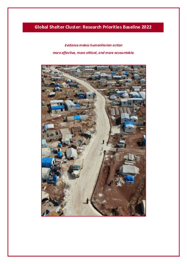 This study seeks to provide an indicative baseline for the research work of the Global Shelter Cluster (GSC) to ensure that this work is itself evidence-based. This report describes the research priorities of humanitarian practitioners engaged in the coordination of humanitarian response, based on analysis of data collected from 20 Cluster Coordinators and 24 academic partner organisations in 42 countries. It also incorporates an earlier GSC study based on a consultation with 11 member organisations of the Global Shelter Cluster Strategic Advisory Group (SAG) .
