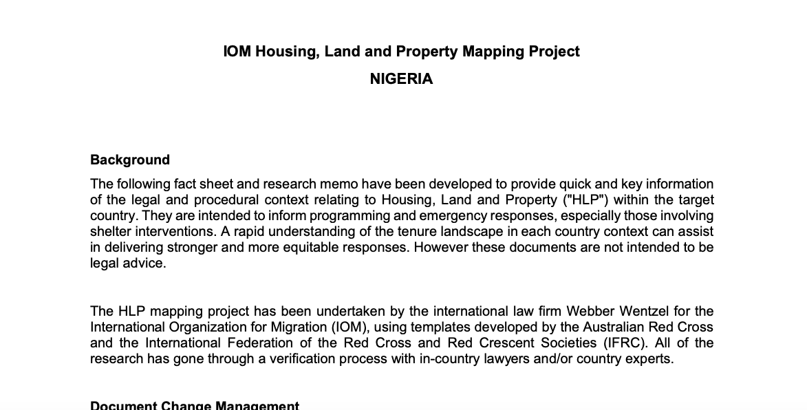 The HLP mapping project has been undertaken by the international law firm Webber Wentzel for the International Organization for Migration (IOM), using templates developed by the Australian Red Cross and the International Federation of the Red Cross and Red Crescent Societies (IFRC). All of the research has gone through a verification process with in-country lawyers and/or country experts.