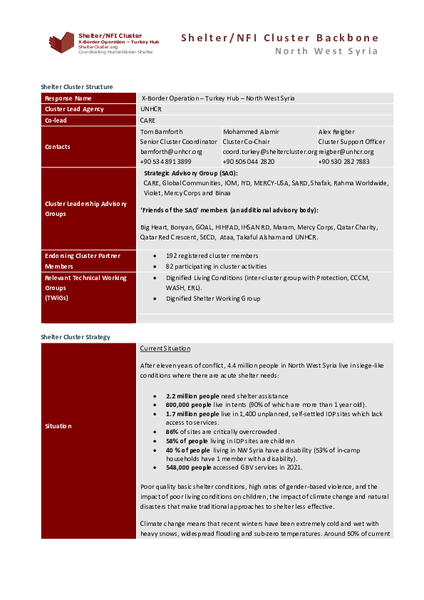 The Shelter/Non-Food Items (S/NFI) Cluster, co-led by UNHCR and CARE, coordinates the efforts of approximately 80 member organizations in the cross-border operation. Based in Gaziantep, South Turkey, S/NFI provides cross-border assistance in north-west Syria and remotely coordinates the response.