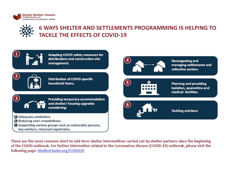 | UNHCR Interim Guidance Shelter Settlement Covid19 | Guides UNHCR field operations in ensuring their planning and operational response considers critical actions to minimise the transmission risk of COVID 19 in populations of concern. | Collective Centers, Hotels, Camp-like settings | Global | English |