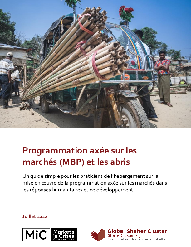 Ce guide simple est pour les praticiens de l'hébergement sur la mise en œuvre de la programmation basée sur le marché dans les réponses humanitaires et de développement. La programmation basée sur le marché (MBP) désigne tout type de programme humanitaire ou de développement, dans n'importe quel secteur, qui utilise, soutient ou développe les marchés locaux. Elle implique la mise en œuvre d'interventions pour répondre aux besoins humanitaires immédiats ou aux besoins de relèvement à plus long terme, d'une manière qui ne sape pas les relations et activités économiques existantes, afin de faciliter le relèvement économique et d'assurer un impact durable. Afin d'illustrer les types de programmes basés sur le marché mis en œuvre par les acteurs de l'humanitaire et du développement, la Communauté de pratique (CoP) des Marchés en Crises a conçu le Cadre de programmation basée sur le marché. Ce cadre se concentre sur une compréhension des marchés en tant que systèmes de marché plutôt qu'en tant que lieux. Il peut s'appliquer à toute MPC sectorielle ou multisectorielle, y compris la programmation d'abris.