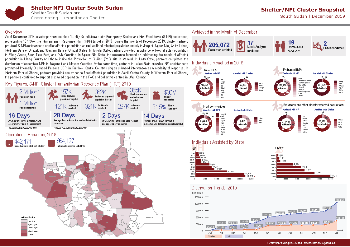 As of December 2019, cluster partners reached 1,036,235 individuals with Emergency Shelter and Non-Food Items (S-NFI) assistance, representing 104 % of the Humanitarian Response Plan (HRP) target in 2019. During the month of December 2019, cluster partners provided S-NFI assistance to conflict affected population as well as flood affected population mainly in Jonglei, Upper Nile, Unity, Lakes, Northern Bahr el Ghazal, and Western Bahr el Ghazal States. In Jonglei State, partners provided assistance to flood affected population in Pibor, Akobo, Uror, Twic East, and Duk Counties. In Upper Nile State, the response focused on addressing the needs of affected population in Ulang County and those inside the Protection of Civilian (PoC) site in Malakal. In Unity State, partners completed the distribution of essentials NFIs in Mayendit and Mayom Counties. At the same time, partners in Lakes State provided NFI assistance to protracted Internally Displaced Persons (IDP) in Rumbek Centre County using cash-based intervention as a modality of response. In Northern Bahr el Ghazal, partners provided assistance to flood affected population in Aweil Centre County. In Western Bahr el Ghazal, the partners continued to support displaced population in the PoC and collective centres in Wau County.
