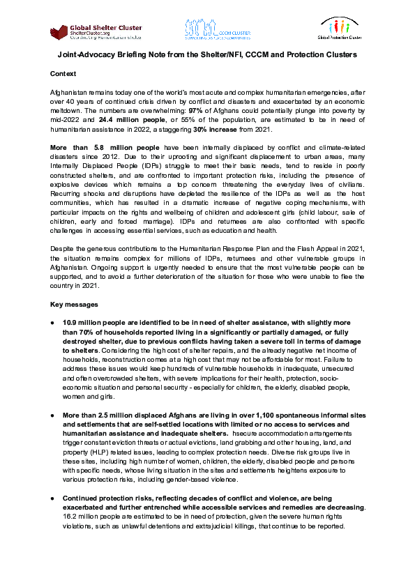 Joint-Advocacy Briefing Note from the Shelter/NFI, CCCM and Protection Clusters