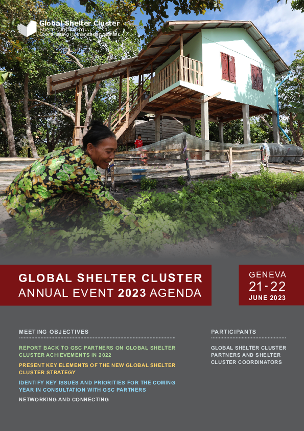The Global Shelter Cluster (GSC) Annual Meeting is being prepared will focus on reflecting on the role of the shelter and settlements interventions in a fast-changing humanitarian landscape. There are a number of objectives for this year's meeting: