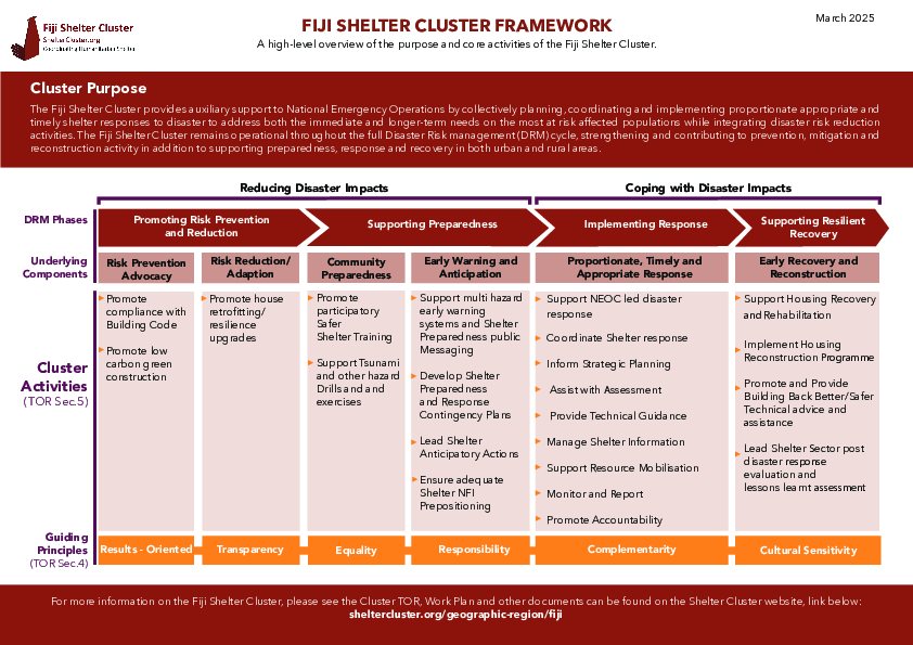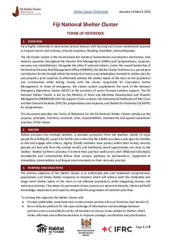 The Fiji National Shelter Cluster is led by the Ministry of Rural and Maritime Development and Disaster Management (MRMDDM) with the support of two co-leads: the International Federation of Red Cross and Red Crescent Societies (IFRC) for preparedness and response, and Habitat for Humanity Fiji (HFHF) for preparedness.