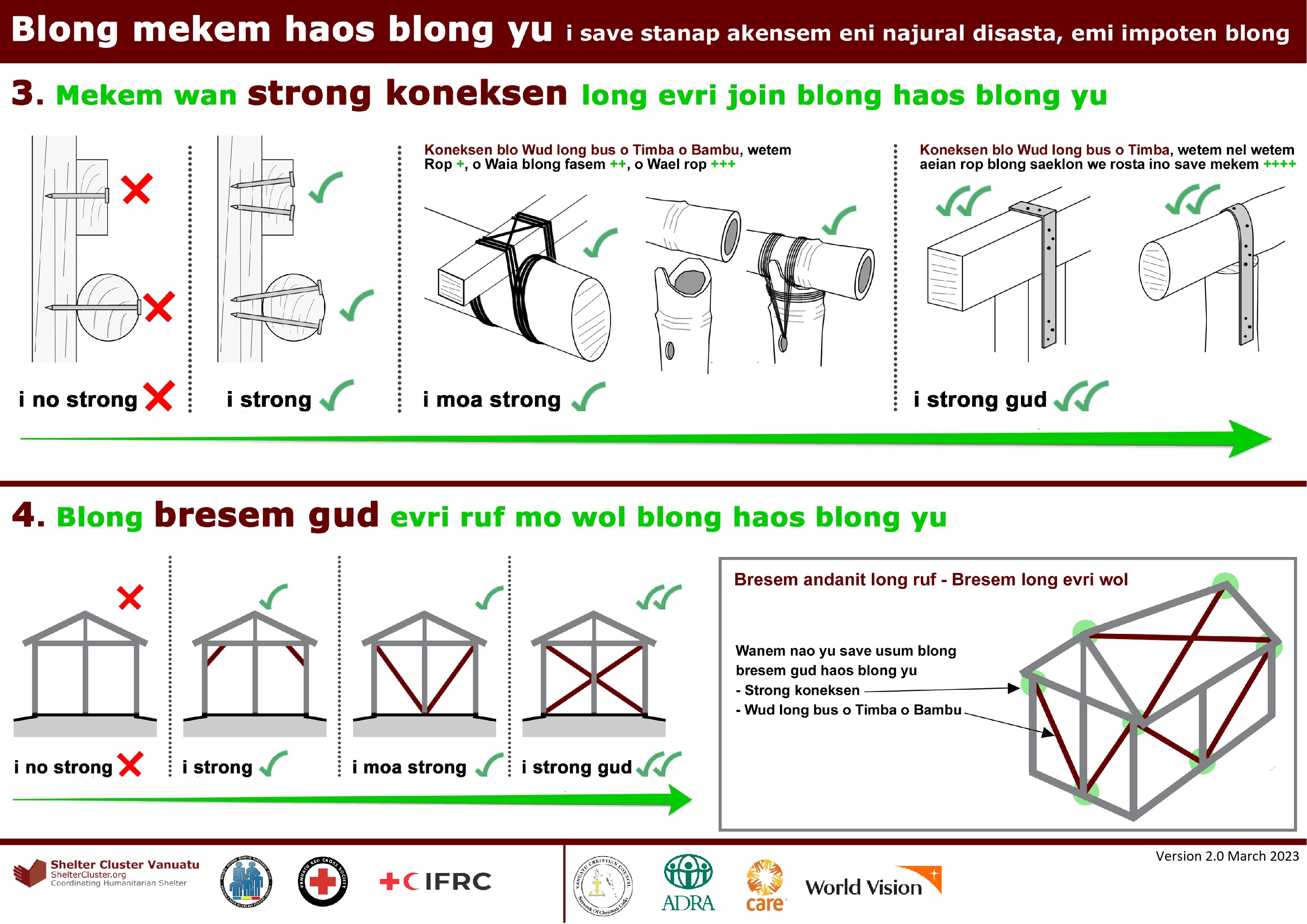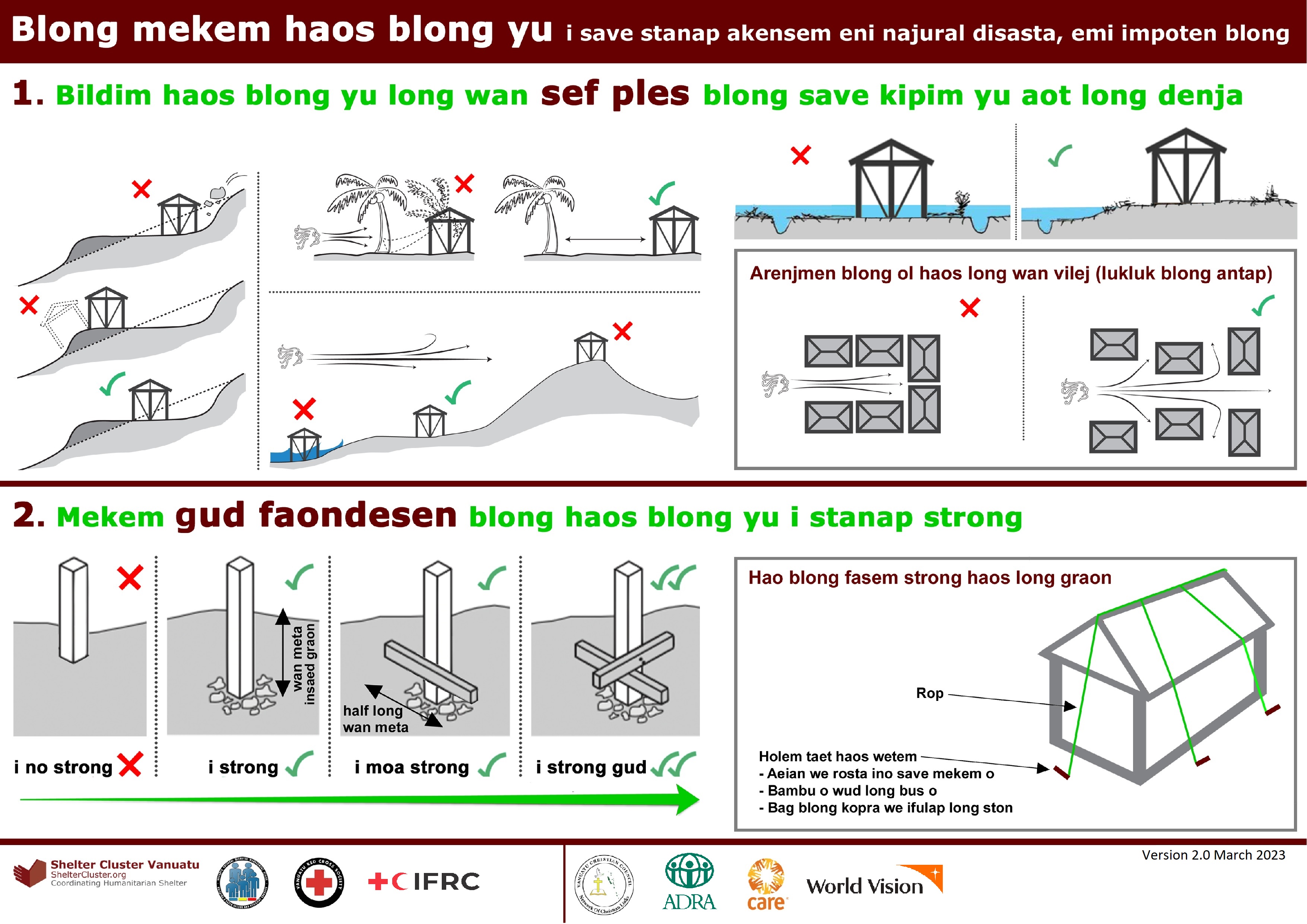 Vanuatu Red Cross Society is also a member of Shelter Cluster Vanuatu, and as co-lead, provides support to NDMO during preparedness and small and medium scale disaster responses, with the support of the International Federation of the Red Cross and Red Crescent Societies (IFRC). IFRC, as convener of the Pacific Shelter Cluster (as part of the Pacific Humanitarian Team) is a member of the SCV and will act as co-lead in support of NDMO for large-scale disaster response.