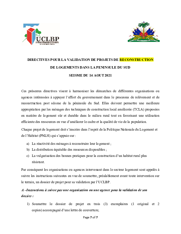 DIRECTIVES POUR LA VALIDATION DE PROJETS DE RECONSTRUCTION DE LOGEMENTS DANS LA PENINSULE DU SUD SEISME DU 14 AOUT 2021