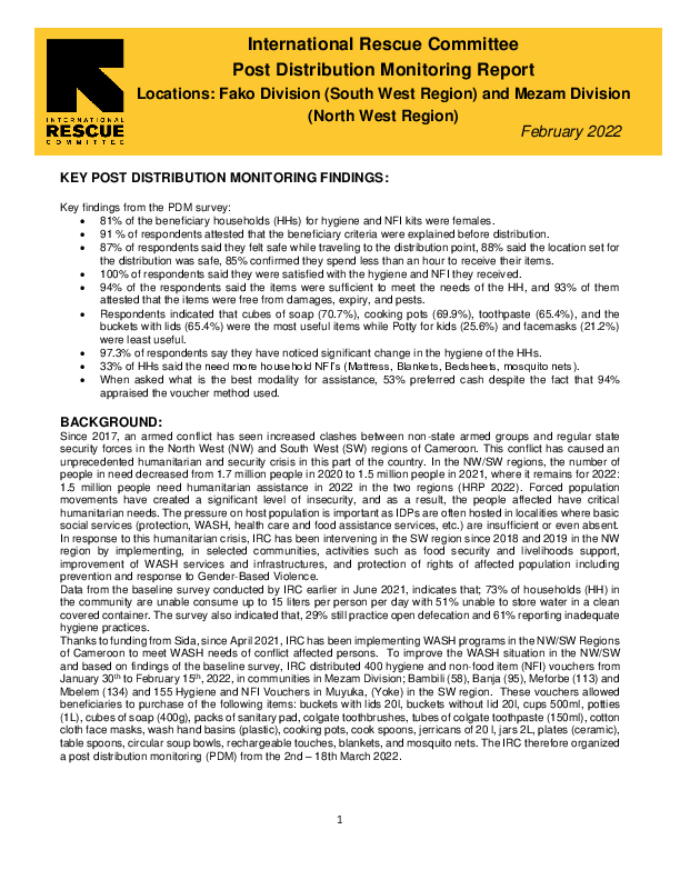 International Rescue Committee Post Distribution Monitoring of Voucher for NFI and Hygiene Items Distribution in February
