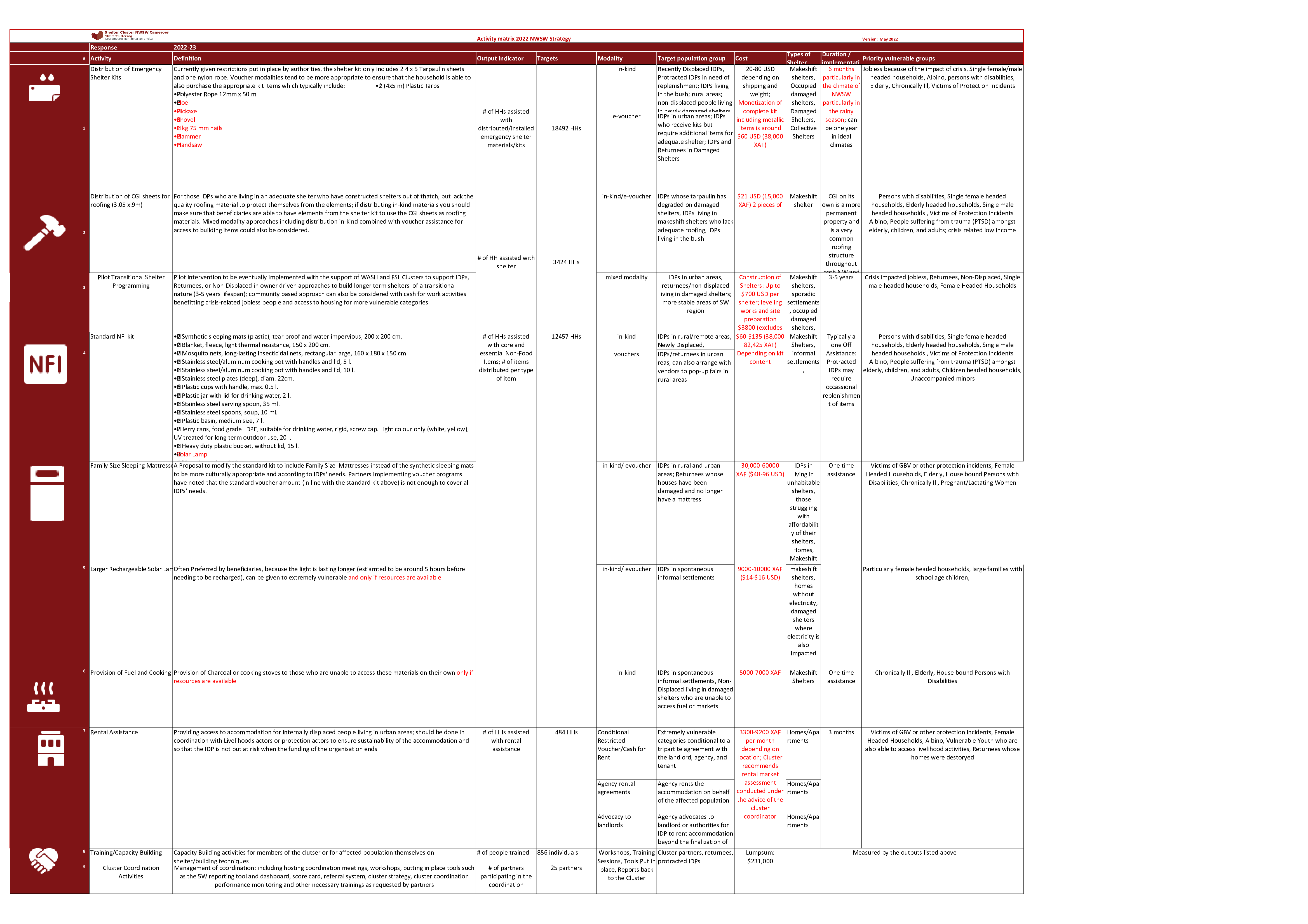 The Northwest Southwest Cameroon Shelter Cluster Activity Matrix represents a summary of the response and standards as agreed by Shelter Cluster partners. It is a simple way of conducting a strategy update. The current version represents the results of discussions held during Shelter Cluster strategy workshops in April.