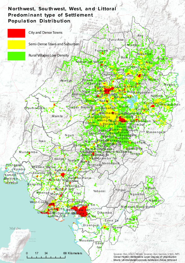Regions Impacted by the Crisis in the Northwest and Southwest Region Degree of Urbanization Analysis (GHSL 2022L1 Aggregation)