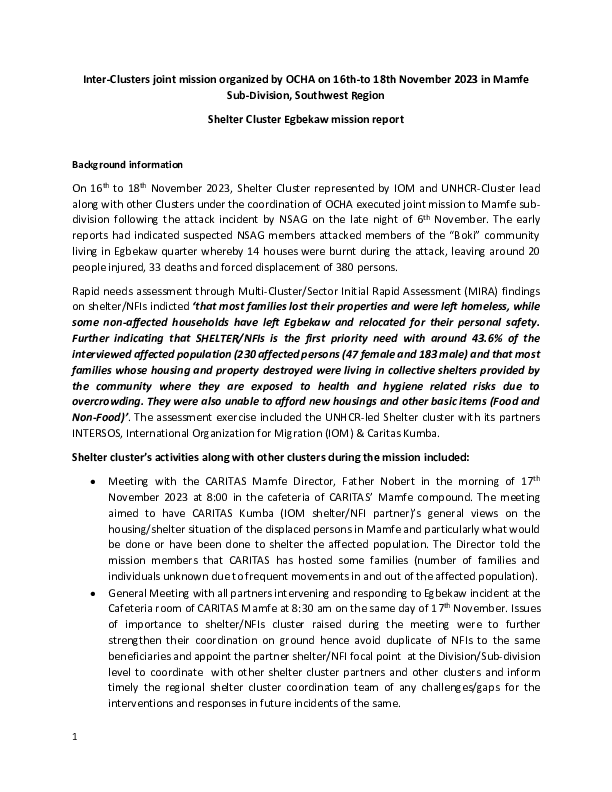Shelter Cluster Egbekaw mission report