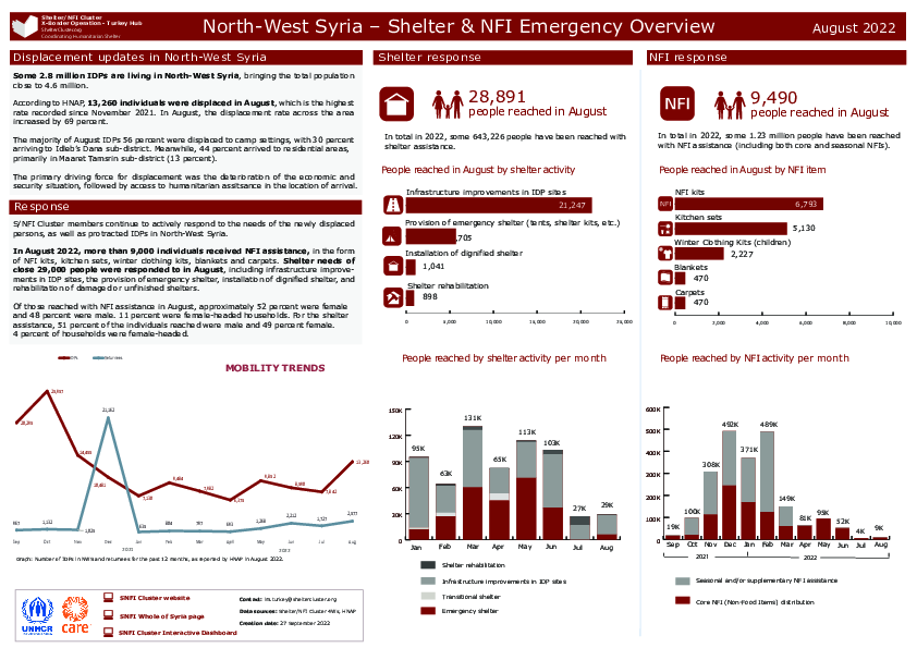 North-West Syria Shelter/NFI Cluster monthly factsheet for August 2022.