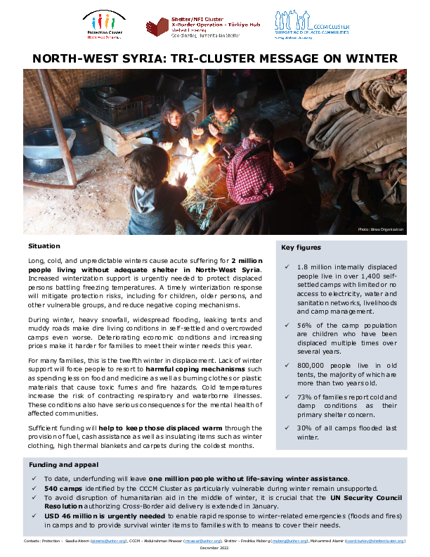 Tri-Cluster Joint Message on Winter in North-West Syria (S/NFI, CCCM & Protection Clusters)