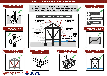Designed for the Philippines, but also applicable to many parts of the Pacific, the 8 Build Back Safer Key Messages were developed through a consultative process with shelter agencies and government as a part of the Typhoon Haiyan / Yolanda response in the Philippines and can be seen as a minimum checklist of disaster risk reduction construction techniques for owner-driven self-recovery in non-engineered, non-architecturally designed lightweight structures that most shelter agencies were dealing with.