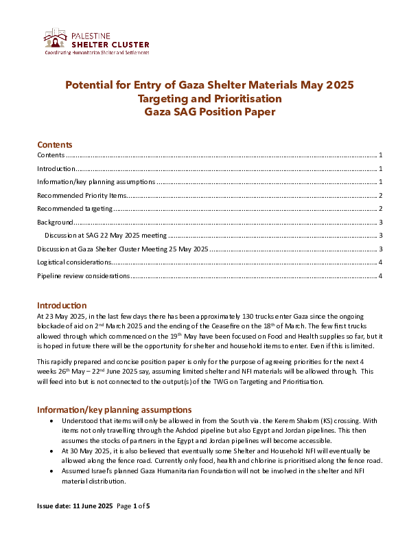 This rapidly prepared and concise position paper developed by the Gaza Shelter Cluster SAG is only for the purpose of agreeing shelter priorities through the next few weeks, assuming limited shelter and NFI materials will be allowed through. This document will feed into but is not connected to the output(s) of the TWG on Targeting and Prioritisation.