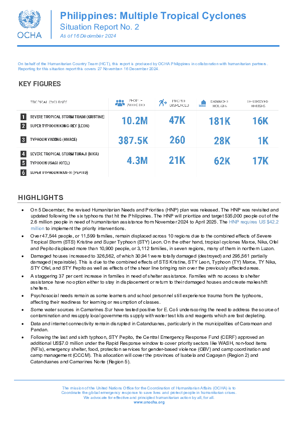 • On 5 December, the revised Humanitarian Needs and Priorities (HNP) plan was released. The HNP was revisited and updated following the six typhoons that hit the Philippines. The HNP will prioritize and target 535,000 people out of the 2.6 million people in need of humanitarian assistance from November 2024 to April 2025. The HNP requires US $42.2 million to implement the priority interventions.