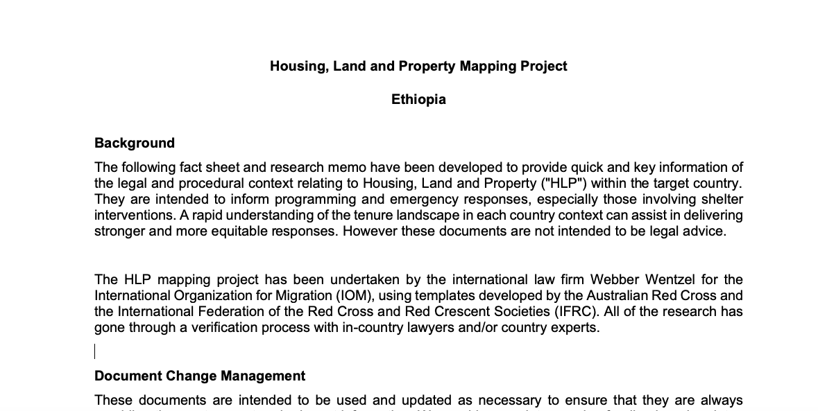The HLP mapping project has been undertaken by the international law firm Webber Wentzel for the International Organization for Migration (IOM), using templates developed by the Australian Red Cross and the International Federation of the Red Cross and Red Crescent Societies (IFRC). All of the research has gone through a verification process with in-country lawyers and/or country experts.