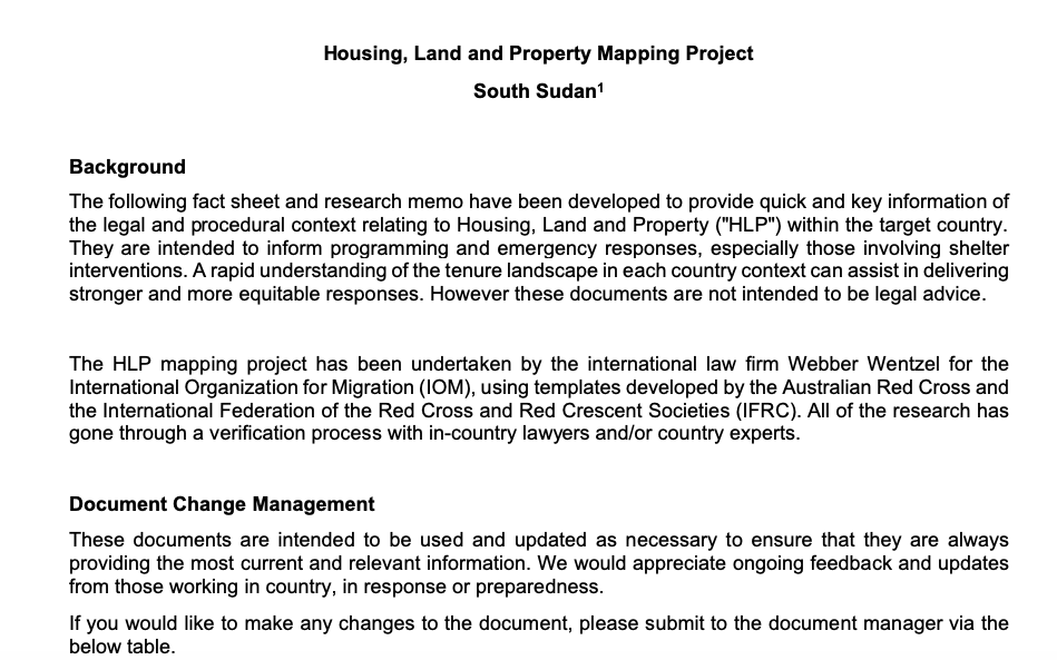 The HLP mapping project has been undertaken by the international law firm Webber Wentzel for the International Organization for Migration (IOM), using templates developed by the Australian Red Cross and the International Federation of the Red Cross and Red Crescent Societies (IFRC). All of the research has gone through a verification process with in-country lawyers and/or country experts.